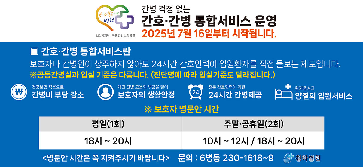 청아병원은 가족같은 병원, 환자를 우선하는 병원을 지향합니다.