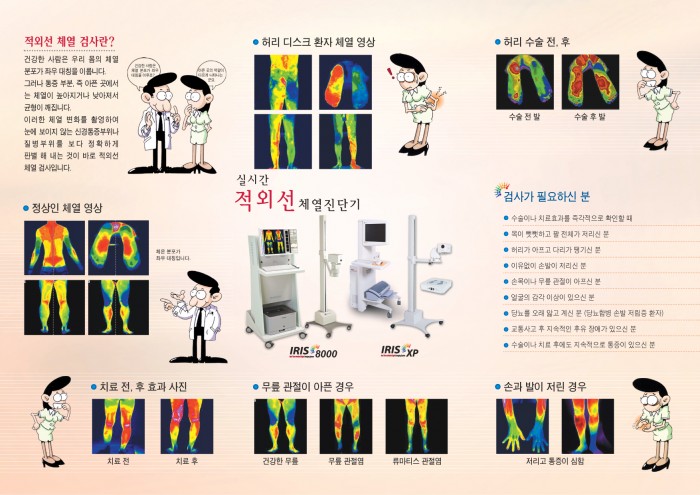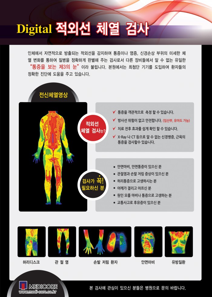 청아병원은 통증·질병 부위의 체열 변화를 보다 정확하고 객관적으로 관찰, 진단하기 위해 기존 장비보다 업그레이드된 고성능 최신 적외선 체열진단기(IRIS-8000)를 도입하여 건강검진센터(지하 1층)에서 운영하고 있습니다.