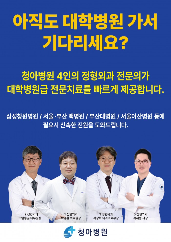 "청아병원 정형외과 전문의료진이 대학병원급 전문진료를 빠르게 제공합니다"